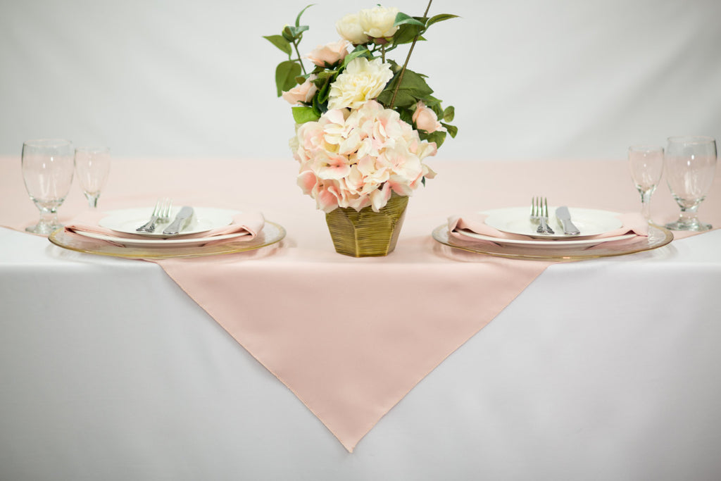 Zhen LinenOur polyester overlay tablecloths are the ideal choice for any setting. With a variety of colors to choose from, you can design any event, informal or formal. Polyester is not only soft but stain-resistant, wrinkle-resistant, and it's the toughest material we have. A 54 inch square blush polyester tablecloth is seamless and durable to withstand several uses for large banquet events and restaurants. Extremely versatile so it can be dressed up for an ultimate glam event or can even be used as a clean modern look for a minimalist event. Pair with any texture such as vintage linen or velvet to enhance your event decor.
